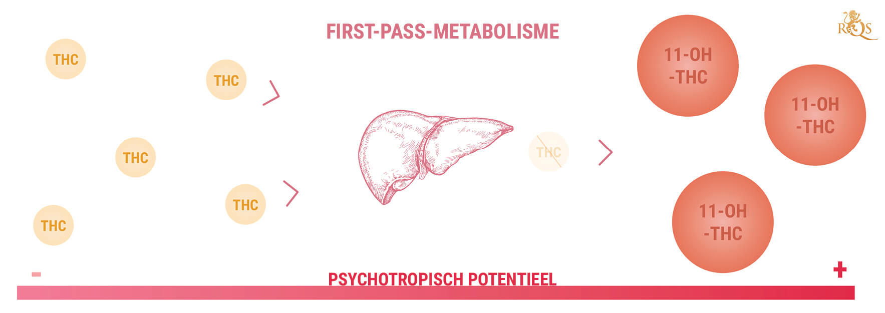 We gaan daar zo uitgebreider op in, maar je vraagt je wellicht af hoe deze omzetting mogelijk is. Orale THC ondergaat tenslotte het first-pass effect. Veel middelen 'verliezen' aan sterkte via deze wijze van toediening, maar THC wordt er juist krachtiger van. Maar wat zorgt nu voor deze sterkere psychoactieve effecten?